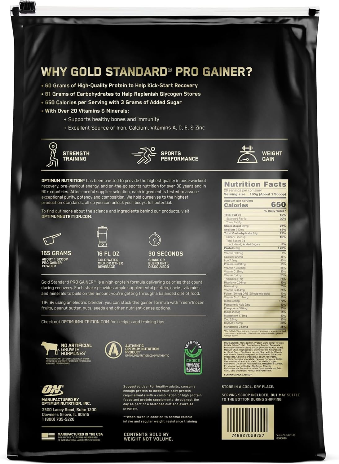 أوبتيموم نيوترشن برو جينر (Optimum Nutrition Pro Gainer) هو مكمل غذائي غني بالبروتين مصمم لزيادة الوزن وبناء العضلات. يوفر كل حصة 60 جرامًا من البروتين و 650 سعرًا حراريًا، مما يساعد على تعويض السعرات الحرارية التي يتم استهلاكها خلال التمارين الرياضية وبناء العضلات.