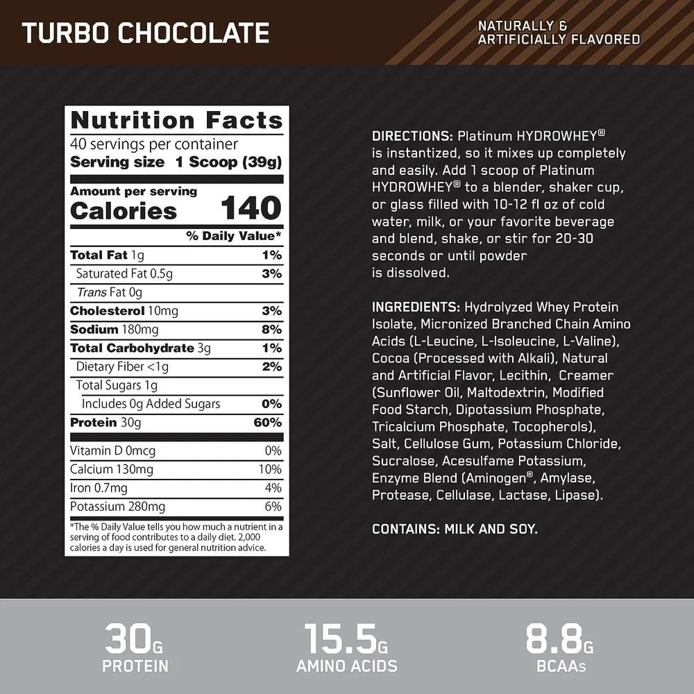 يعتبر بلاتينوم هيدرو واي بروتين من اوبتيموم نيوترشن أحد أفضل أنواع البروتين، فهو المركب الناتج عن تفكيك الواي بروتين إلى جزيئات صغيرة سهلة الهضم "ميكرونايزد"، بالإضافة إلى احتوائه على انزيمات هاضمة تجعل منه بروتين سريع الأمتصاص، حيث يحتاج إلى 15-30 دقيقة فقط ليتم امتصاصه وتخزينه في العضلات.