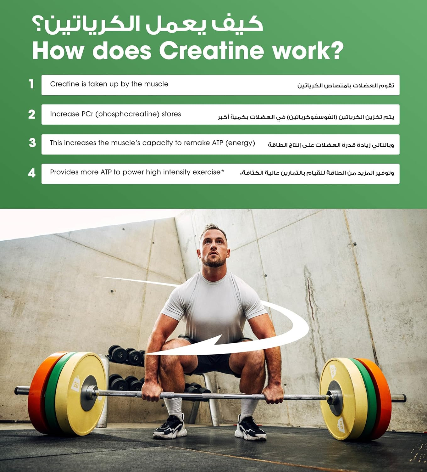 الكرياتين يساعد على زيادة إنتاج الطاقة في العضلات، مما يؤدي إلى زيادة القوة والقدرة على تحمل الأثقال.