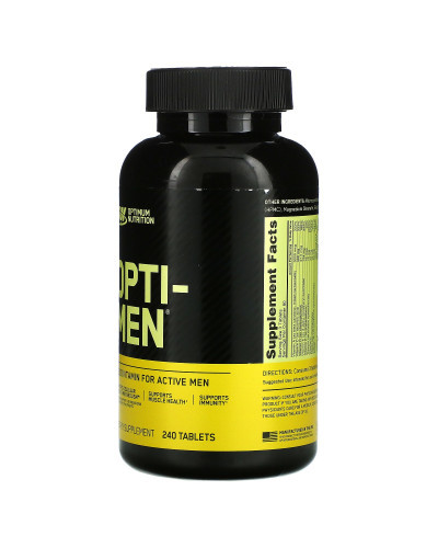 240 Opti-Men عبارة عن مكمل غذائي متعدد الفيتامينات والمعادن والأحماض الأمينية والخلاصات النباتية مخصص للرجال. يحتوي على مجموعة متنوعة من الفيتامينات والمعادن والأحماض الأمينية لتعزيز الصحة العامة والنشاط.