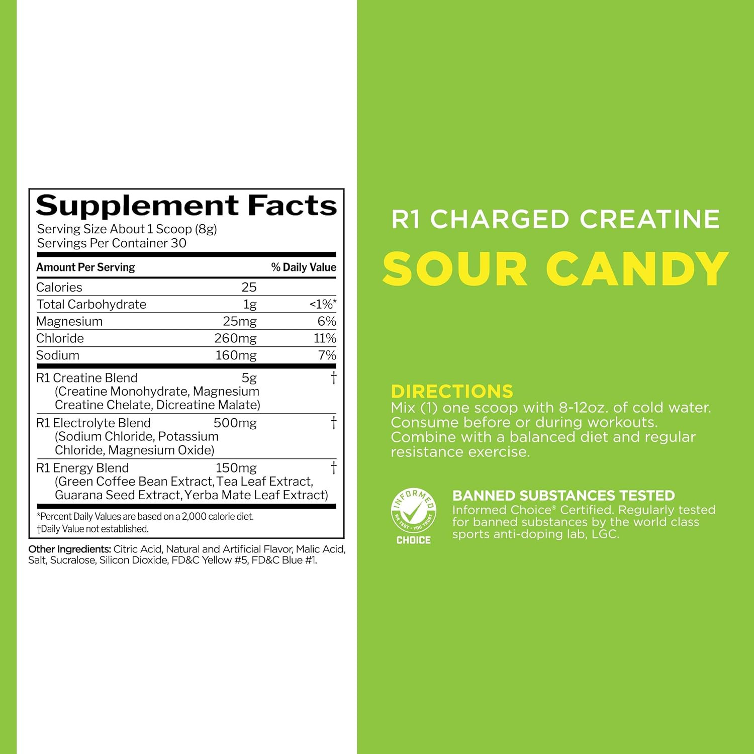 يحتوي على 5 غرامات من مزيج الكرياتين الذي يتكون من ثلاث أشكال مختلفة: الكرياتين أحادي الهيدرات، ومخلب كرياتين المغنيسيوم، ومالات الكرياتين.